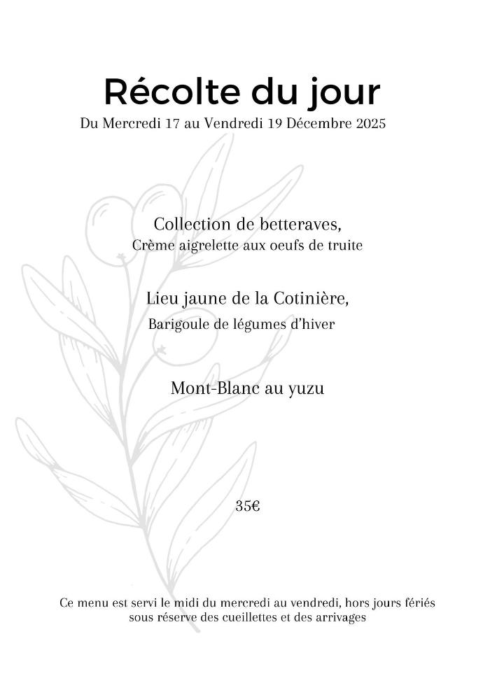 Chaque jour, le Chef donne libre cours à son inspiration, selon la saison, et propose une entrée, un plat et un dessert à partir de produits rares et nobles. Création éphémère pour gourmets curieux.